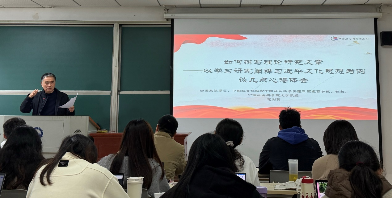 2025年10月24日,第十四届全国政协委员、中国社会科学出版社原党委书记、社长,中国社会科学院大学教授、博士生导师赵剑英应邀来学院,为学院2025级硕士生作题为《如何撰写理论研究文章——以学习研究阐释习近平文化思想为例谈几点心得体会》的学术报告。报告会由学院袁银传教授主持。